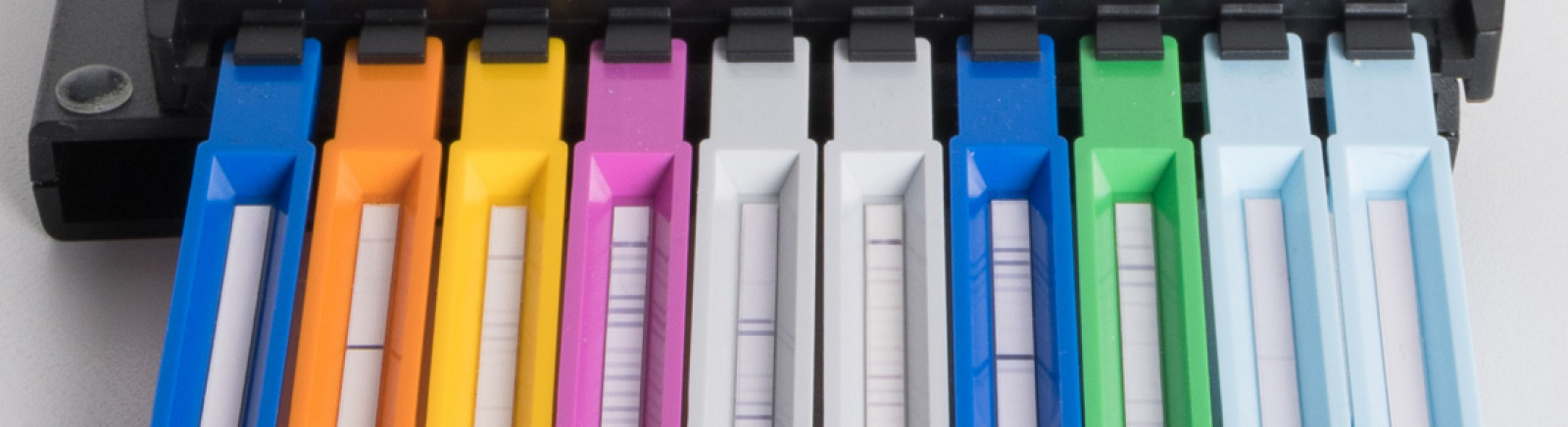 6. After thoroughly drying the test strip, an evaluation of the colouration of the allergen lines is carried out by an Improvio scanner. The concentration of allergen-specific IgE in the serum/plasma sample is determined and results are given in decimal classes (from 0 to 6) and IU/ml (range 0 to 100 IU/ml).